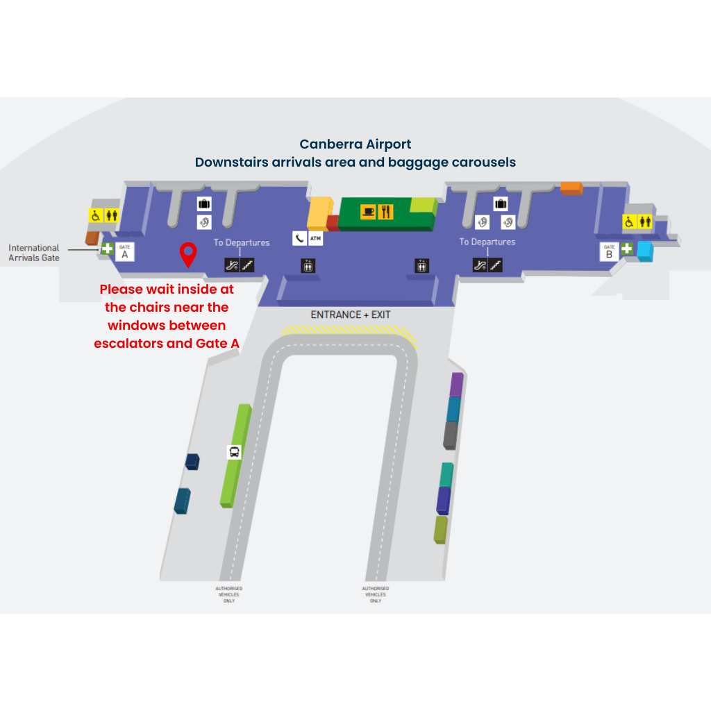 10:00am – Canberra Airport (downstairs arrival area pick up details here)